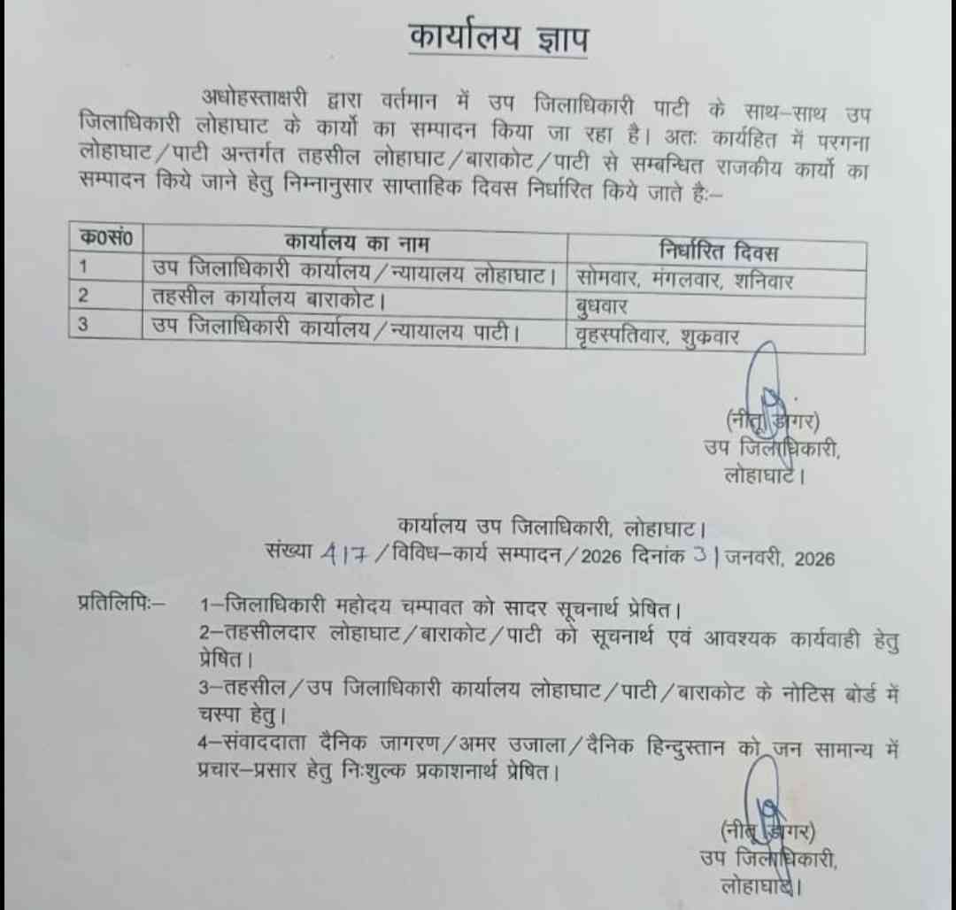 रिपोर्ट: लक्ष्मण बिष्ट : लोहाघाट:रोस्टर के हिसाब से जन समस्याओं का समाधान और सरकारी कार्यों का संपादन करेंगी एसडीएम लोहाघाट