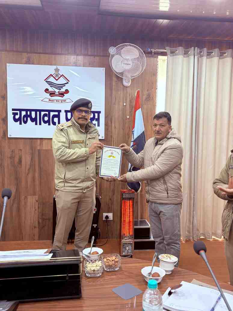 दोनों के सराहनीय कार्य के लिए पुलिस अधीक्षक चम्पावत अजय गणपति के द्वारा आज शुक्रवार को दोनों को सम्मानित किया गया तथा पुलिस के साथ मिलकर किए गए उनके स्वच्छ, निस्वार्थ एवं साहसिक कार्य की भूरि-भूरि प्रशंसा की गई। मालूम हो मदन सामंत के द्वारा दुर्घटना में घायल कई व्यक्तियों की जान बचाई जा चुकी है।एसपी चंपावत ने कहा चम्पावत पुलिस ऐसे संवेदनशील एवं मानवीय सहयोग के लिए स्थानीय नागरिकों का आभार व्यक्त करती है तथा भविष्य में भी इसी प्रकार पुलिस–जन सहयोग बनाए रखने की अपील करती है।