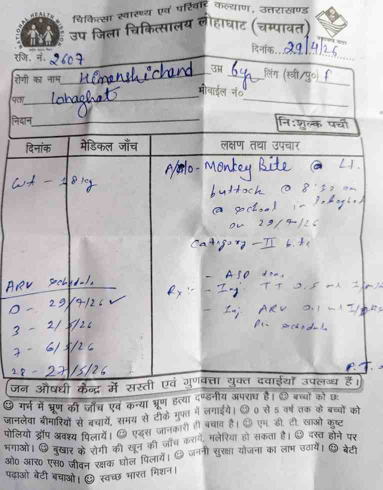रिपोर्ट:लक्ष्मण बिष्ट : लोहाघाट मे बंदरों का आतंक स्कूल में छात्रा को काट कर किया घायल।