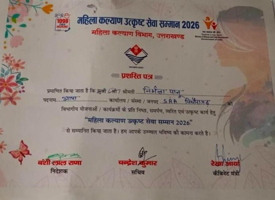 6 मार्च अंतर्राष्ट्रीय महिला दिवस के अवसर पर राजभवन स्थित लोक भवन में आयोजित महिला कल्याण उत्कृष्ट सेवा सम्मान एवं ‘मेरी पहचान–2026’ कार्यक्रम में विभिन्न क्षेत्रों में उत्कृष्ट कार्य करने वाले कर्मचारियों, अधिकारियों और सरकारी योजनाओं के लाभार्थियों को सम्मानित किया गया।कार्यक्रम में राज्यपाल लेफ्टिनेंट जनरल गुरमीत सिंह और महिला सशक्तिकरण एवं बाल विकास मंत्री रेखा आर्या ने संयुक्त रूप से सम्मान प्रदान किए। सम्मान समारोह में पिथौरागढ़ की निर्मला पानू को महिला सशक्तिकरण के लिए सरकार द्वारा चलाई गई योजनाओं मे उनके द्वारा किए गए उत्कृष्ट कार्य के लिए महिला कल्याण उत्कृष्ट सेवा सम्मान 2026 से राजपाल व खेल मंत्री रेखा आर्य ने सम्मानित किया तथा उनके द्वारा किए जा रहे कार्यों की सराहना की।कार्यक्रम में राज्यपाल ने कहा कि उत्तराखंड की महिलाओं ने पिछले एक दशक में बहुत तेजी से प्रगति की है और 2047 के विकसित भारत में यहां की महिलाएं बड़ा योगदान करेंगी।