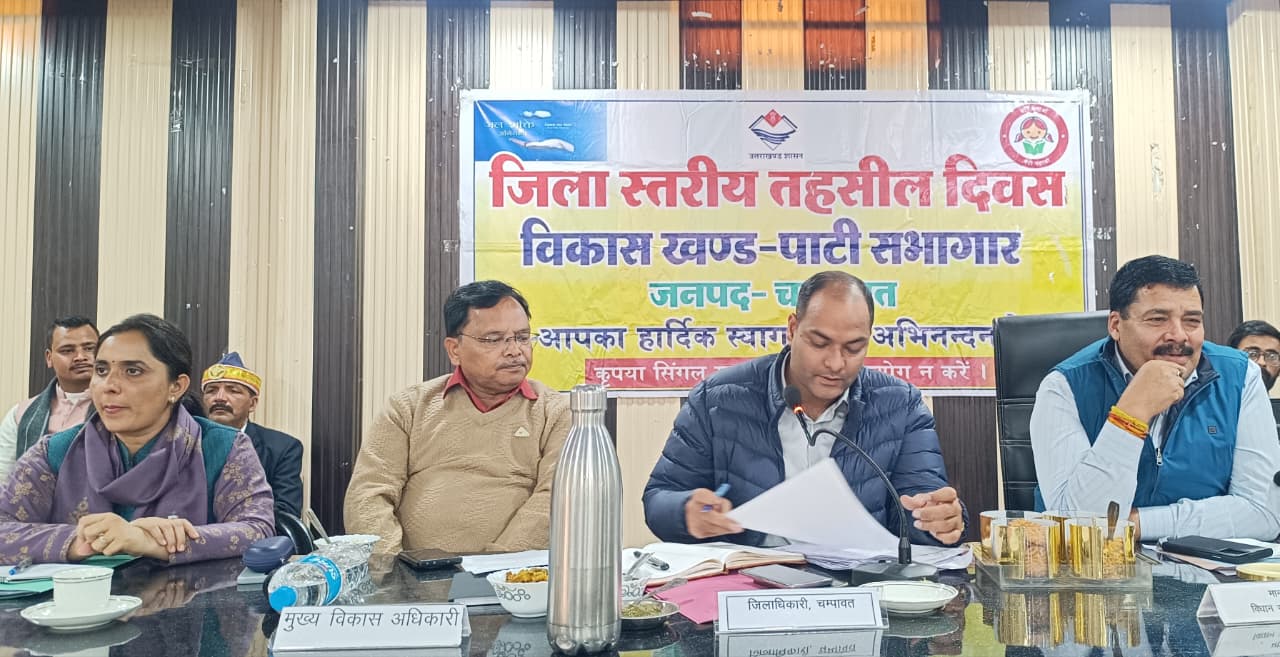 जिलाधिकारी चंपावत मनीष कुमार की अध्यक्षता में मंगलवार को चंपावत जिले के विकासखंड सभागार पाटी में जिला स्तरीय तहसील दिवस का आयोजन किया गया। इस दौरान दूरस्थ ग्रामीण क्षेत्रों से आए नागरिकों की कुल 63 शिकायतें एवं समस्याएं दर्ज की गईं, जिनके त्वरित एवं प्रभावी निस्तारण हेतु संबंधित विभागों के अधिकारियों को स्पष्ट निर्देश दिए गए।तहसील दिवस में बिजली, पेयजल, सड़क निर्माण, सुरक्षा दीवार, घेर-बाड़, गौशाला निर्माण, आवास आवंटन, चिकित्सा एवं अन्य सम्बन्धित विषय सामने आए। जिलाधिकारी ने सभी प्रकरणों को गंभीरता से लेते हुए अधिकारियों को मौके पर जाकर समाधान सुनिश्चित करने के निर्देश दिए। तहसील दिवस में सुरेश चंद्र गहतोड़ी एवं महेश चंद्र गहतोड़ी द्वारा छिनकाछिड़ा – रोलमेल मोटर मार्ग में भूस्खलन रोकने हेतु सुरक्षा दीवार एवं मार्ग सुधारीकरण की मांग पर लोक निर्माण विभाग एवं सम्बन्धित विभाग को तत्काल स्थलीय निरीक्षण कर सुरक्षात्मक कार्य प्रारंभ करने के निर्देश दिए गए।