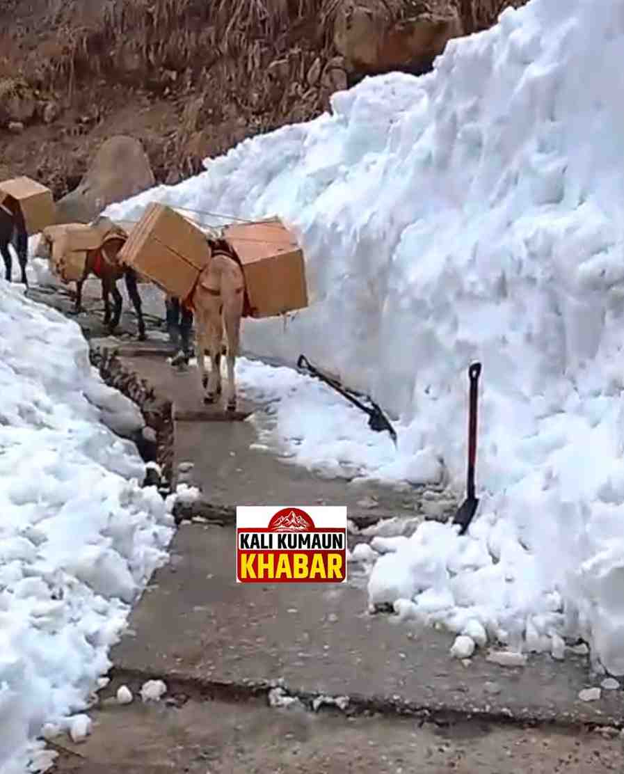 घोड़े-खच्चरों के जरिए धाम तक पहुंच रहा जरूरी सामान बर्फ हटाने का कार्य लगातार जारी ।