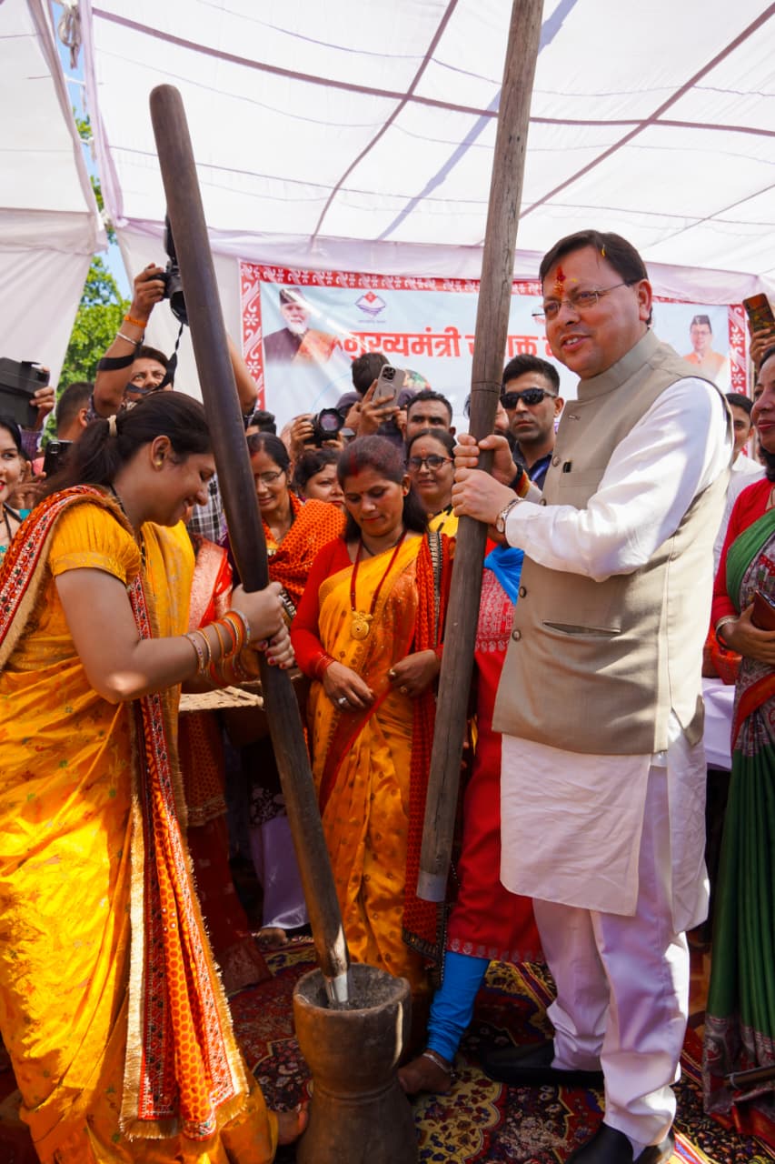 मुख्यमंत्री पुष्कर सिंह धामी ने गुरुवार को टनकपुर के छीनीगोठ में आयोजित “मुख्यमंत्री सशक्त बहना उत्सव” में प्रतिभाग कर महिलाओं के आत्मविश्वास, उद्यमशीलता और पारंपरिक कौशल का उत्सव मनाया।पारंपरिक लोक संगीत और सांस्कृतिक उल्लास से भरे इस आयोजन में महिलाओं ने पारंपरिक परिधान पहनकर मुख्यमंत्री का ढोल-दामऊ और छोलिया नृत्य के साथ स्वागत किया, जबकि विद्यालय के बच्चों ने बैंड वादन से वातावरण को और भी ऊर्जावान बना दिया।कार्यक्रम में पहुंचने पर मुख्यमंत्री ने महिलाओं और बेटियों के उत्साह को देखकर प्रसन्नता व्यक्त की। उन्होंने कहा कि “महिलाओं की भागीदारी से ही ‘विकसित उत्तराखण्ड’ का सपना साकार होगा। राज्य सरकार महिलाओं को केवल सहयोग नहीं दे रही, बल्कि उन्हें सशक्त और आत्मनिर्भर बनाने के लिए प्रतिबद्ध है।”मुख्यमंत्री धामी ने उत्सव स्थल पर लगे विभिन्न लाइव स्टालों का अवलोकन किया और महिलाओं के श्रम व कौशल को प्रत्यक्ष रूप से अनुभव किया। उन्होंने न केवल प्रदर्शनी देखी, बल्कि महिलाओं की गतिविधियों में स्वयं भाग लेकर उन्हें प्रेरित किया।मुख्यमंत्री धामी ने एक स्टाल पर जाकर महिलाओं के साथ पारंपरिक तरीके से मट्ठा बनाने की प्रक्रिया में भाग लिया। उन्होंने कहा कि पारंपरिक खाद्य पदार्थ हमारी संस्कृति और स्वास्थ्य दोनों से जुड़े हैं, इन्हें आधुनिक रूप में बाजार से जोड़ना समय की मांग है।इसके बाद मुख्यमंत्री ने दीपावली पर्व के अवसर पर कुमाऊँ की प्रसिद्ध लोक कला ऐंपण बनाई और इस पारंपरिक कला को संरक्षित व प्रसारित करने की आवश्यकता पर बल दिया।इलेक्ट्रिक कार्यों में संलग्न महिलाओं के स्टाल पर पहुँचकर मुख्यमंत्री ने महिलाओं के साथ दीपावली की लाइटों की सोल्डरिंग करते हुए “लोकल फॉर वोकल” के मंत्र को साकार रूप दिया। उन्होंने कहा कि “महिलाएँ अब केवल उपभोक्ता नहीं, बल्कि उत्पादक और उद्यमी बन रही हैं — यही आत्मनिर्भर भारत की असली तस्वीर है।” मुख्यमंत्री ने दीपावली पर महिलाओं द्वारा निर्मित अधिक से अधिक उत्पाद खरीदने का आह्वान किया।मुख्यमंत्री ने कृषि आधारित गतिविधियों की सराहना करते हुए महिलाओं के साथ ओखल में धान कूटने की प्रक्रिया में भी सहयोग किया। उन्होंने कहा कि पारंपरिक कृषि पद्धतियाँ और हस्तनिर्मित खाद्य पदार्थ आज स्वास्थ्य, पर्यटन और ग्रामीण अर्थव्यवस्था से सीधे जुड़ रहे हैं। उन्होंने इस दिशा में महिलाओं के योगदान को प्रदेश की ग्रामीण अर्थव्यवस्था की रीढ़ बताया।कार्यक्रम के दौरान मुख्यमंत्री ने स्थानीय व्यंजनों का स्वाद लिया और महिला समूहों द्वारा तैयार उत्पादों की भूरि-भूरि प्रशंसा की। उन्होंने कहा कि आने वाले समय में उत्तराखण्ड के हर जिले में ऐसे उत्