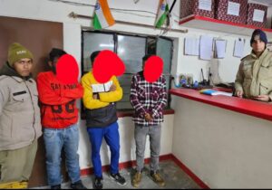 बुघवार की रात चंपावत के कर्नाटक अस्पताल के पास, कार व बाइक चालकों द्वारा मुख्य मार्ग में अपने वाहनों को बेतरतीब खड़ा कर हल्ला गुल्ला कर आपस में लड़ाई झगड़ा किया जा रहा था। जिसपर रात्रि अधिकारी उपनिरीक्षक ललित पांडेय द्वारा तीनो को काफी समझाने का प्रयास किया गया पर वे नहीं माने जिसपर एसआई ललित पांडे ने कार चालक और उसके साथी एवं मोटरसाइकिल चालक को गिरफ्तार कर मेडिकल परीक्षण कराया गया मेडिकल रिपोर्ट में तीनों व्यक्तियों द्वारा शराब पीने की पुष्टि हुई है पुलिस ने दोनों वाहन चालकों को धारा03/181,39/92,185,207 एमबी एक्ट के तहत गिरफ्तार कर दोनों वाहनों को सीज कर दिया। कार में बैठे तीसरे व्यक्ति को धारा 81 पुलिस एक्ट में गिरफ्तार किया गया। गिरफ्तारी की सूचना इनके परिजनों को दी जा रही है। तीनो अभियुक्त त्रिलोक चंद्र पुत्र मानसिंह उम्र 28 वर्ष निवासी मल्ली मादली चम्पावत,किशोर कुमार गणेश राम उम्र 25 वर्ष निवासी निवासी चौड़ा राजपुरा चम्पावत ,प्रवीण कुमार पुत्र शंकर राम उम्र 28 वर्ष निवासी चौड़ा राजपुरा के निवासी हैं पुलिस ने वेगनआर -UK03A-1960 तथा बाइक -UK03A-0406 को सीज कर दिया है