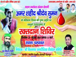 प्रदेश भर में प्रतिवर्ष चलाई जाने वाली बाबा विश्वनाथ मां जगदीशिला डोली रथ यात्रा के संयोजक पूर्व कैबिनेट मंत्री मंत्री प्रसाद मैथानी द्वारा गुरुवार को अमर शहीद श्री देव सुमन की जयंती पर रक्तदान शिविर का आयोजन पूरे प्रदेश में करवाया जा रहा है जिसमें चंपावत जनपद के जिला समन्वयक चिराग फर्त्याल के नेतृत्व में यूथ कांग्रेस के कार्यकर्ताओ ने चंपावत जिला अस्पताल में 8यूनिट रक्तदान किया गया एवं अमर शहीद श्रीदेव सुमन को याद किया गया वही यूथ कांग्रेस विधानसभा