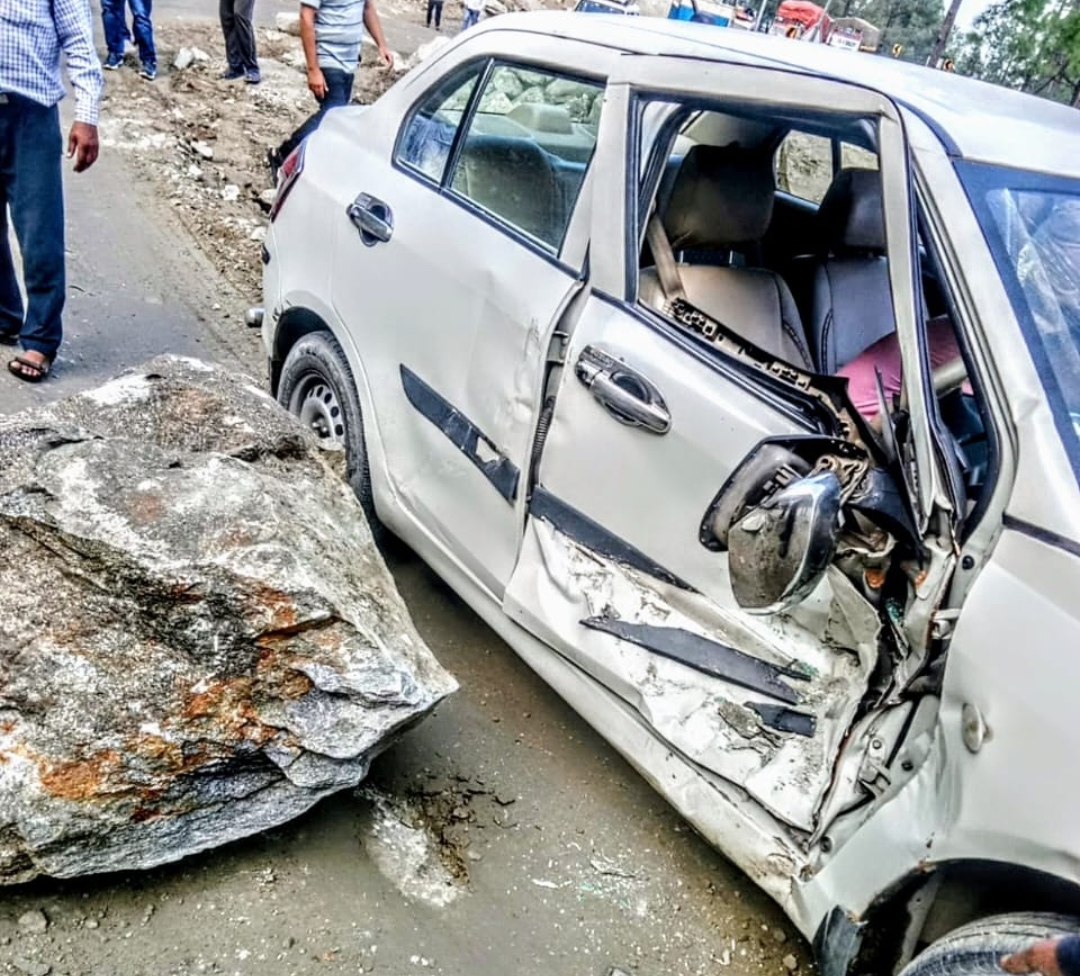 स्वाला में कार में गिरा बोल्डर बाल बाल बचा बड़ा हादसा खाई में जाने से बची कार