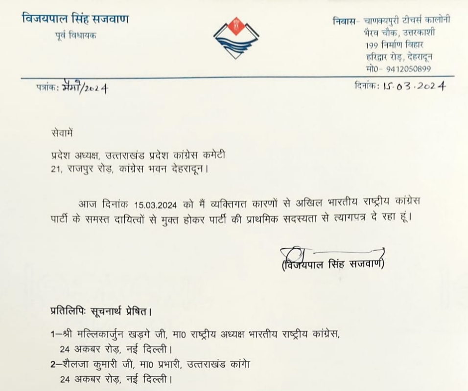 : गंगोत्री:कांग्रेस को बड़ा झटका दिग्गज नेता व गंगोत्री से दो बार के विधायक विजयपाल सिंह सजवान ने कांग्रेस से दिया इस्तीफा
