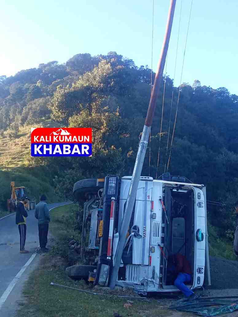 रिपोर्ट:लक्ष्मण बिष्ट : चंपावत:मंच में विद्युत पोल से टकराकर सड़क में पलटा डंपर बीएसएनल टावर व खोकिया की बिजली हुई गुल।