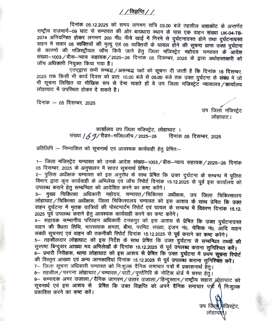 रिपोर्ट:लक्ष्मण बिष्ट : लोहाघाट:एसडीएम लोहाघाट नीतू डांगर करेंगी बागधारा दुर्घटना की जांच। पांच लोगों की हुई थी मौत।
