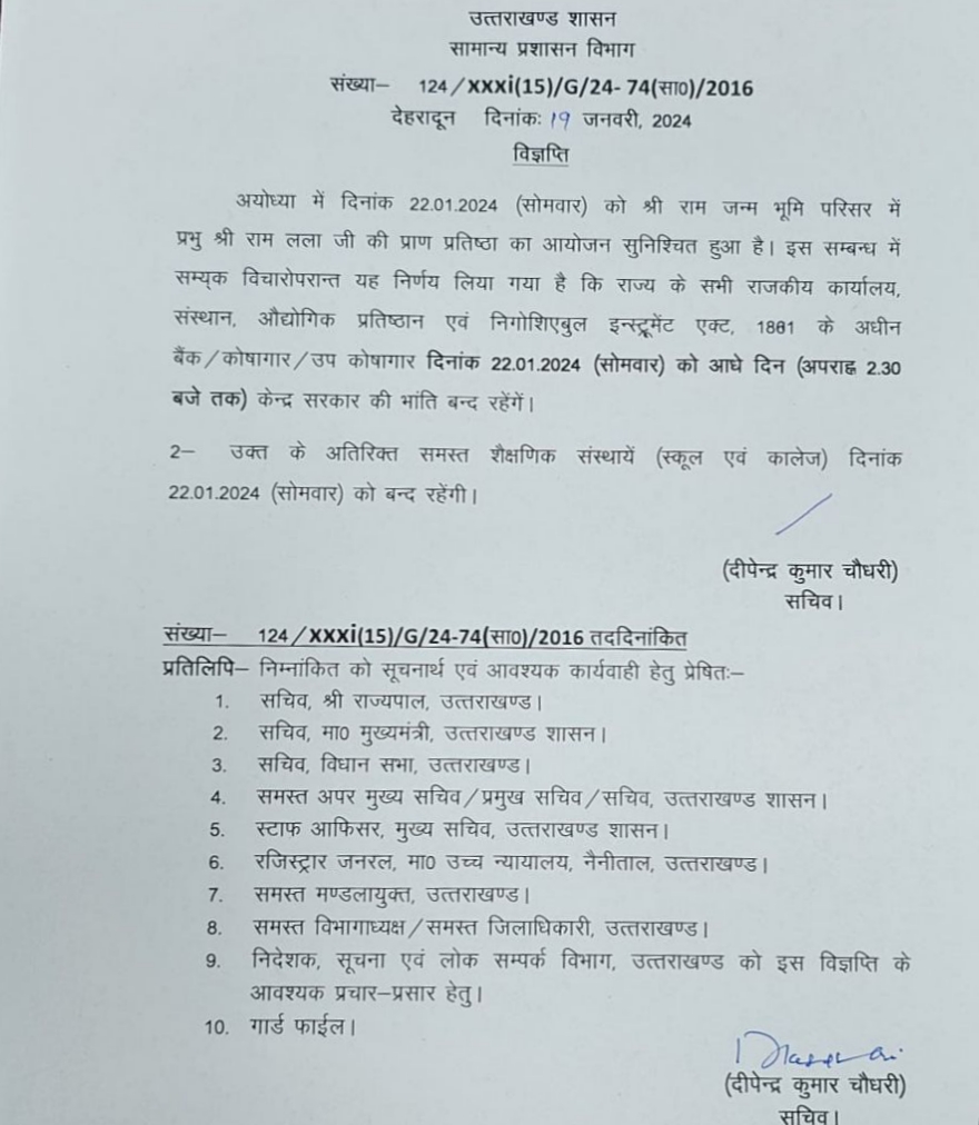 : देहरादून:राम मंदिर प्राण प्रतिष्ठा कार्यक्रम को लेकर 22 जनवरी को प्रदेश के बैंक कोषागार आधे दिन रहेंगे बंद शासन ने आदेश किए जारी