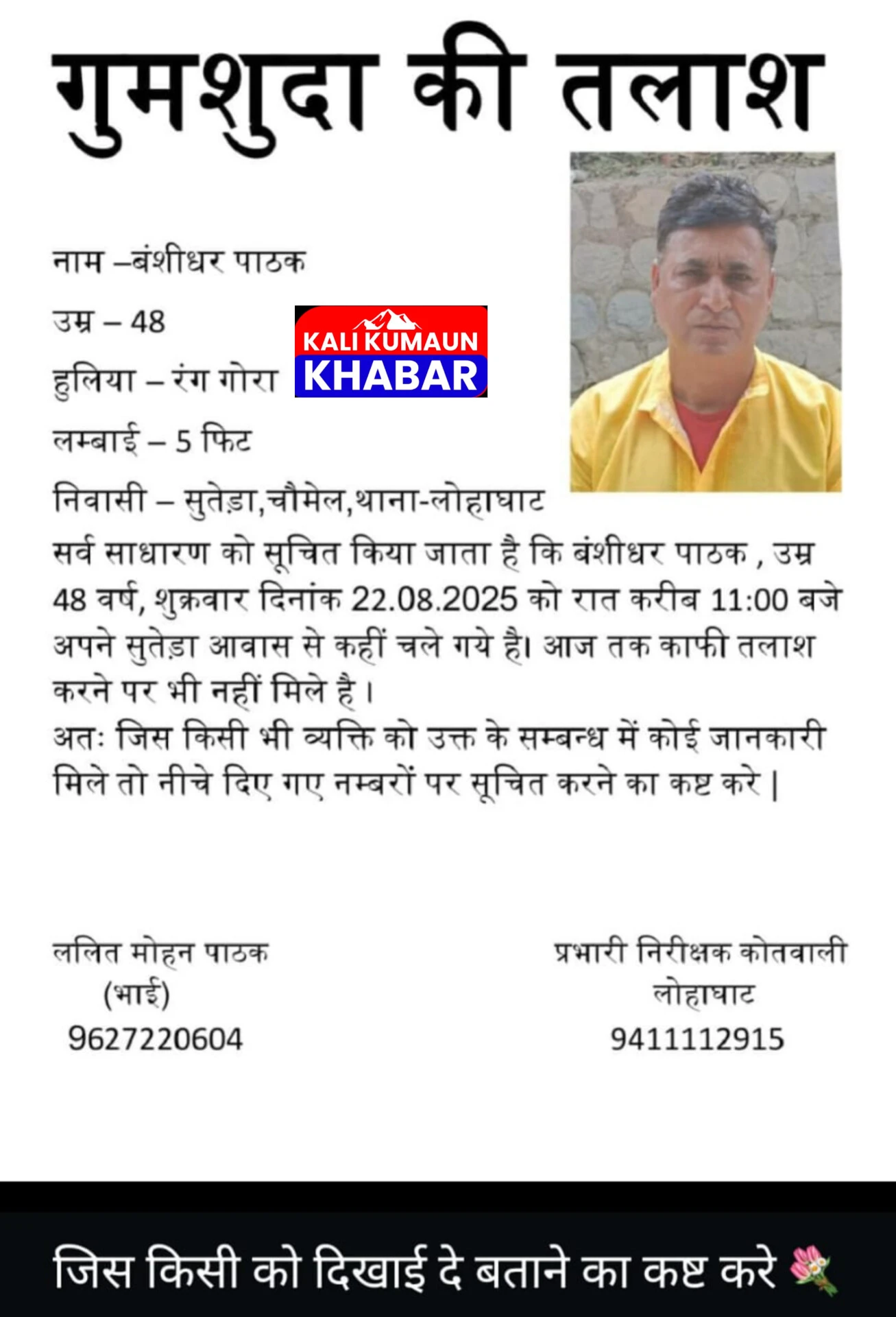 रिपोर्ट: जगदीश जोशी : बाराकोट:सुतेड़ा चौमेल से 48 वर्षीय बंशीधर पाठक लापता । परिजनों ने थाने में दर्ज की गुमशुदगी।