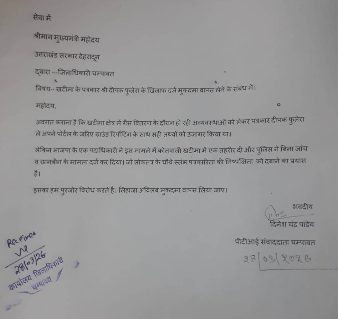 खटीमा के पत्रकार दीपक फुलेरा पर भाजपा नेता की तहरीर पर दर्ज किए गए मुकदमे से चंपावत जिले के पत्रकारों में गहरा आक्रोश फैल गया है।चंपावत के वरिष्ठ पत्रकार पीटीआई संवाददाता दिनेश चंद्र पांडे ने मामले में गहरी नाराजगी जताते हुए इसे पत्रकार उत्पीड़न बताया। मामले में उन्होंने शनिवार को जिलाधिकारी चंपावत मनीष कुमार के माध्यम से मुख्यमंत्री को ज्ञापन भेज पत्रकार फुलेरा के खिलाफ किए गए मुकदमे को वापस लेने की मांग की है। ज्ञापन के माध्यम से पांडे ने कहा खटीमा क्षेत्र में गैस वितरण के दौरान हो रही अव्यवस्थाओं को लेकर पत्रकार दीपक फुलेरा ने अपने पोर्टल के जरिए ग्राउंड रिर्पोटिंग के साथ सही तथ्यों को उजागर किया था।