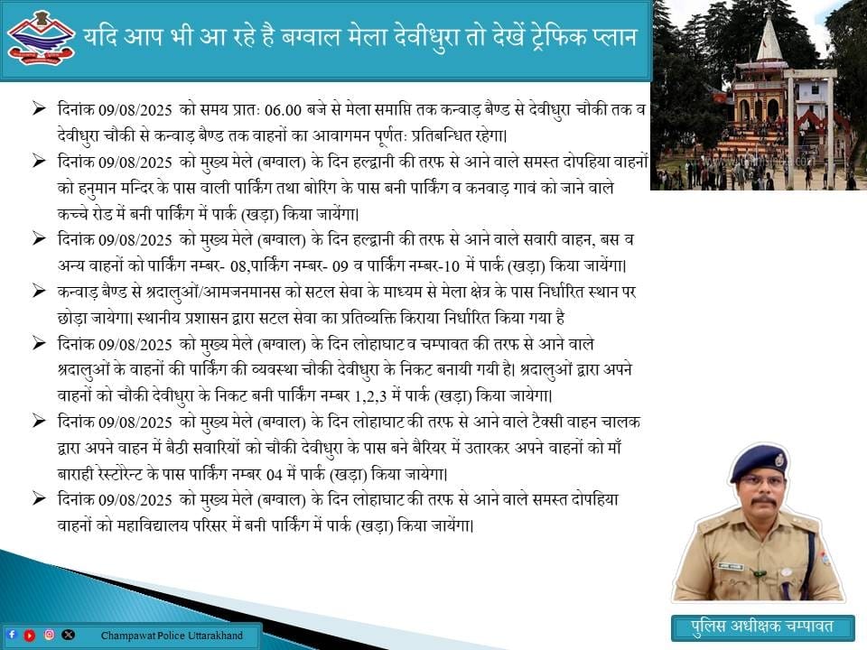 बग्वाल मेल को लेकर चंपावत पुलिस ने बनाया ट्रैफिक प्लान।कल 9 अगस्त को चंपावत जिले के प्रसिद्ध मां बाराही धाम देवीधुरा में रक्षा बंधन के अवसर पर विश्व प्रसिद्ध बग्वाल खेली जाएगी। बग्वाल देखने तथा मां बाराही के दर्शनों के लिए हजारों की संख्या में भक्त देवीधुरा पहुंचेंगे। इतनी बड़ी संख्या में श्रद्धालुओं के पहुंचने से यातायात में होने वाली अव्यवस्था को लेकर चंपावत पुलिस ने एसपी चंपावत के निर्देश पर नया ट्रैफिक प्लान बनाया है ताकि मेला क्षेत्र में किसी भी प्रकार की अव्यवस्थाएं ना हो। एसपी चंपावत अजय गणपति ने मेले में आने वाले सभी श्रद्धालुओं से असुविधा से बचने के लिए पुलिस के द्वारा बनाए गए ट्रैफिक प्लान का पालन करने की अपील की है तथा सभी क्षेत्रवासियों को रक्षाबंधन की शुभकामनाएं एसपी चंपावत के द्वारा दी गई है।