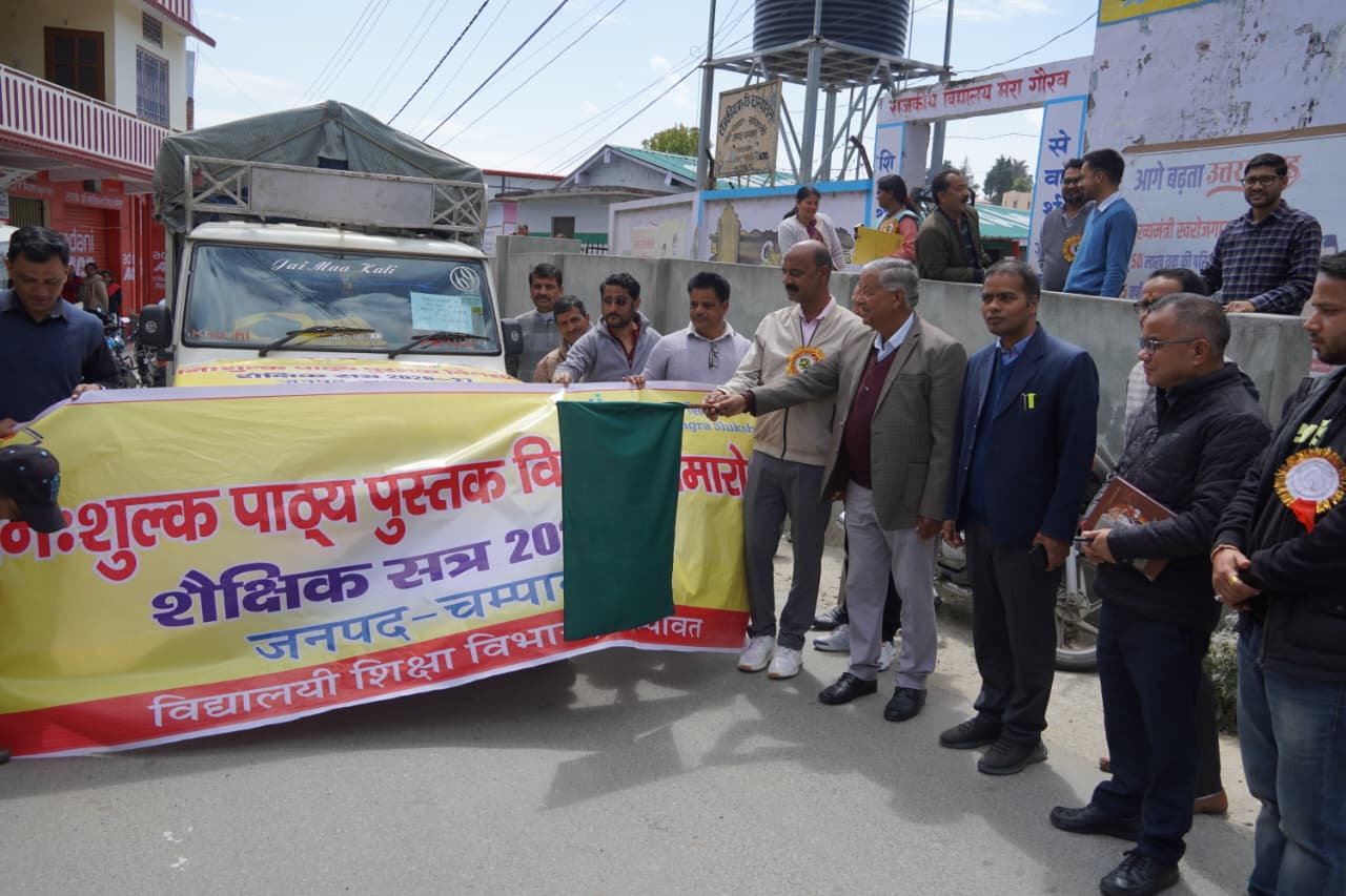 चंपावत।समग्र शिक्षा अभियान के अंतर्गत शिक्षण सत्र 2026–27 के लिए जनपद चम्पावत में निःशुल्क पाठ्यपुस्तक वितरण कार्यक्रम का शुभारंभ राजकीय प्राथमिक विद्यालय, चम्पावत से किया गया। कार्यक्रम के दौरान जनपद के समस्त न्याय पंचायतों में समयबद्ध रूप से पुस्तकों की आपूर्ति सुनिश्चित करने हेतु वाहनों को हरी झंडी दिखाकर रवाना किया गया।कार्यक्रम में मुख्य अतिथि दर्जा राज्य मंत्री श्याम नारायण पांडे, विधायक प्रतिनिधि प्रकाश तिवारी एवं अपर जिलाधिकारी कृष्णनाथ गोस्वामी द्वारा संयुक्त रूप से कार्यक्रम का शुभारंभ किया गया। इस अवसर पर अतिथियों ने विद्यालय के छात्र-छात्राओं को निःशुल्क पाठ्यपुस्तकें वितरित कर उनके उज्ज्वल भविष्य की कामना की।