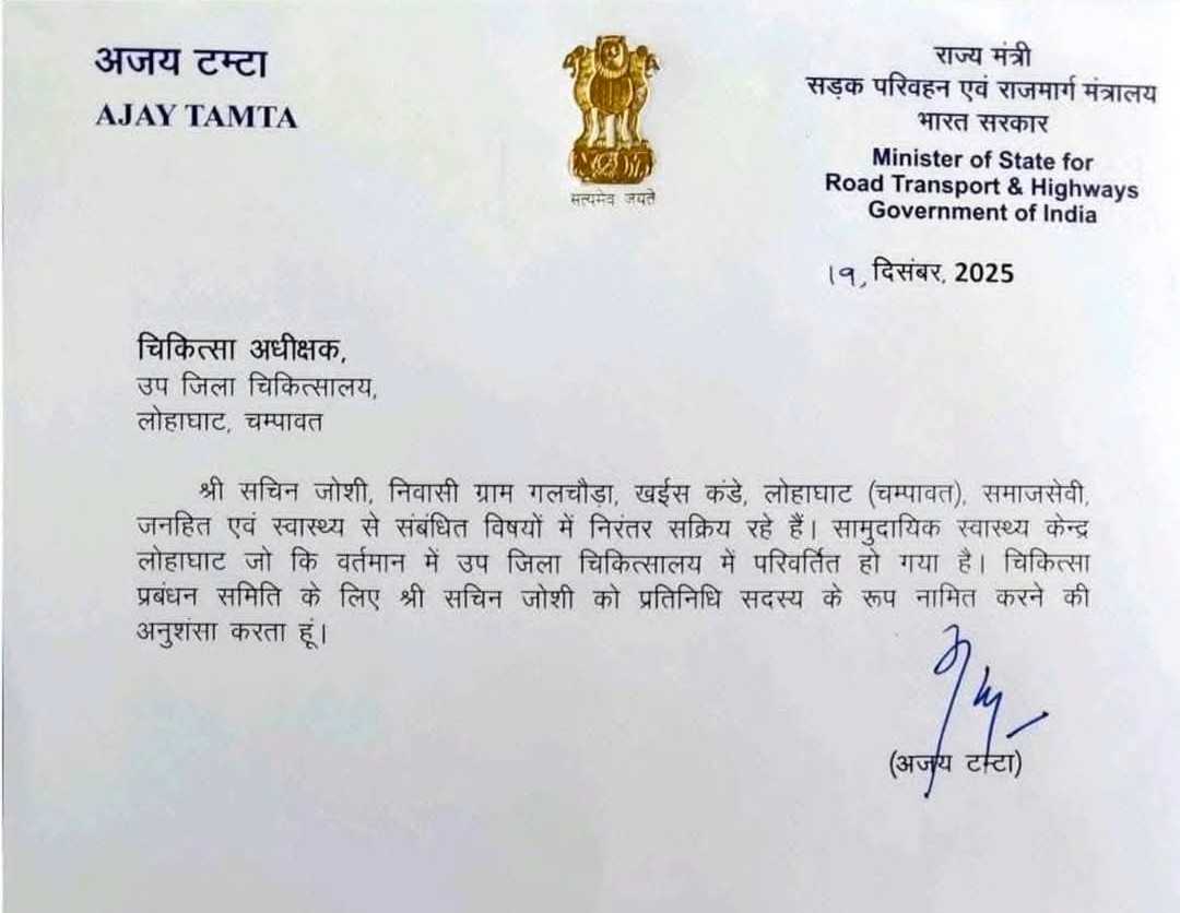 सांसद अजय टमटा ने जनसेवक सचिन जोशी को बनाया उप जिला चिकित्सालय प्रबंधन समिति सदस्य