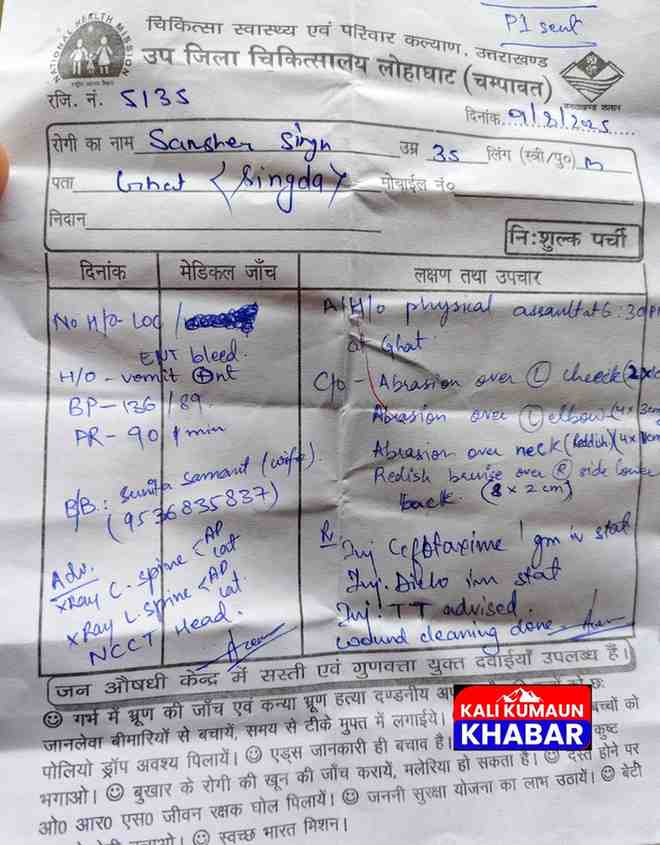 लोहाघाट। चंपावत में खाकी में आरोप लगा है आरोप लगने का कारण कोई और नहीं खुद पुलिसकर्मी है। घटना के अनुसार शनिवार शाम 6:30 बजे के लगभग घाट के पुराने पुल के पास मछली भात का होटल चलाने वाले शमशेर सिंह सामंत उर्फ श्यामू पुत्र अमर सिंह सामंत निवासी सिंगदा अपने होटल से स्कूटी में लोहाघाट की ओर आ रहे थे। तभी घाट चौकी में तैनात पुलिस कर्मी ने उनको बुरी तरह पीट दिया जिसमें होटल स्वामी शमशेर उर्फ श्यामू घायल हो गया। होटल स्वामी शमशेर ने बताया वह घाट पुलिस चौकी के पास सामान खरीदने के लिए रुका था चौकी के बाहर भीड़ हो रही थी मे भी खड़ा हो गया ।कहा तभी चौकी में तैनात पुलिस कर्मी पवन ने बेमतलब गाली गलौज करते हुए उनकी बुरी तरह पिटाई कर दी अन्य पुलिसकर्मी व लोगों ने उन्हें पुलिसकर्मी के चंगुल से बचाया ।उन्होंने बताया पुलिसकर्मी के हमले में उन्हें काफी चोटे आई हैं उनके द्वारा घटना के लगभग आधे घंटे के बाद घटना की सूचना 112 के माध्यम से पुलिस को दी तथा किसी तरह अपनी पत्नी के साथ लोहाघाट उप जिला चिकित्सालय पहुंचा जहां उनका उपचार किया गया।