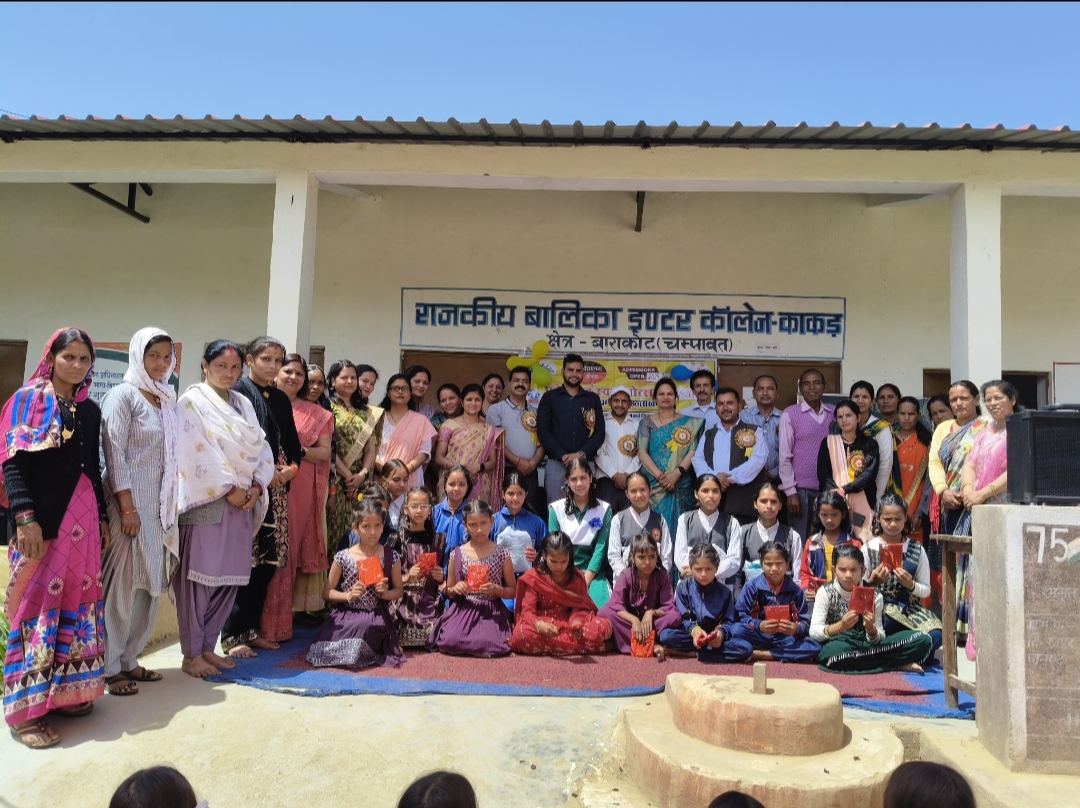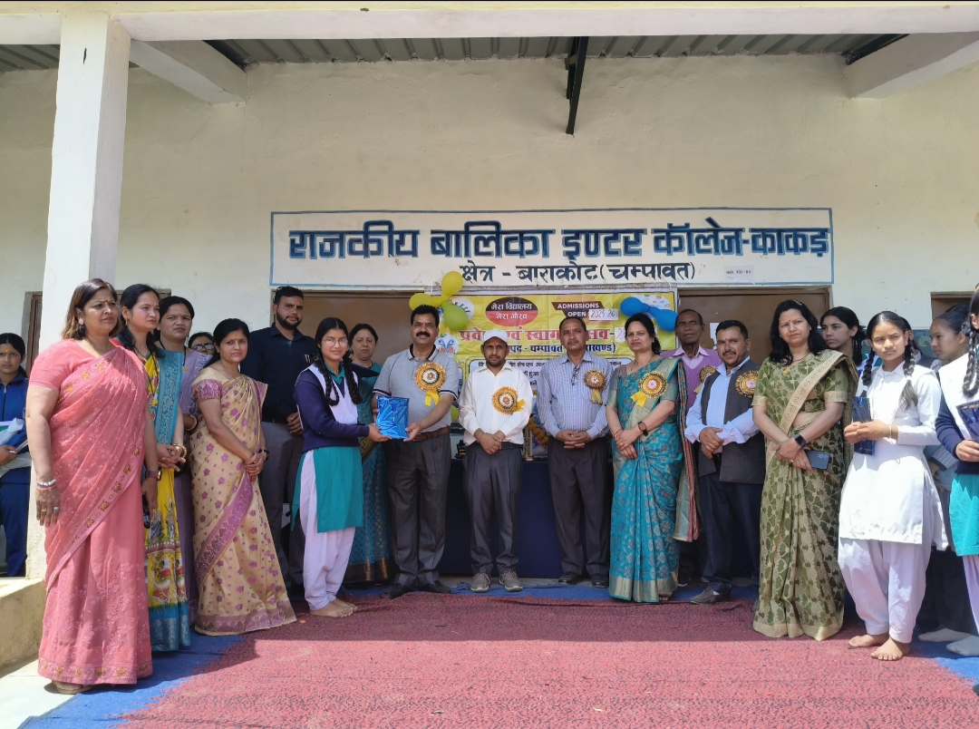 जीजीआईसी काकड़ में धूमधाम से मनाया गया प्रवेश उत्सव।चंपावत जिले के बाराकोट ब्लॉक के राजकीय बालिका इंटर कॉलेज काकड़ में सोमवार को प्रवेश उत्सव बड़ी धूमधाम से मनाया गया। विद्यालय की प्रधानाचार्या श्रीमती तुलसी गोस्वामी की अध्यक्षता एवं शिक्षिका श्रीमती दीपा पांडे के संचालन में नव प्रवेशी छात्राओं का भव्य स्वागत किया गया।कार्यक्रम के मुख्य अतिथि ज्येष्ठ प्रमुख नन्दावल्लभ बगौली एवं विशिष्ट अतिथि उपखंड शिक्षा अधिकारी कमल भट्ट रहे। कार्यक्रम की शुरुआत छात्राओं के द्वारा सरस्वती वंदना से की गई विद्यालय की छात्राओं द्वारा कुमाऊनी ,गढ़वाली, पंजाबी ,राजस्थानी नृत्य की एक से बढ़कर एक सुंदर प्रस्तुतियाँ दी गई। कार्यक्रम में विद्यालय की शिक्षिकाए ममता पाटनी, आशा पांडे,कुसुमलता मुरारी, ज्योति बोहरा,मिताली भट्ट,आंचल , अंजली विश्वकर्मा, दयाल ढेक,पार्वती देवी,पंकज भारती, हेम जोशी, कार्यक्रम में डायट लोहाघाट से आये डॉ0 अरूण कुमार तलनिया जी, सामाजिक कार्यकर्ता लोकमान् अधिकारी ,शिवराज अधिकारी, पूर्व सूबेदार ललित अधिकारी ,एस0 एम0 सी0 अध्यक्ष श्रीमती बबीता देवी,पी0 टी0 ए0 अध्यक्ष श्रीमती प्रिया पन्त उपस्थित रहे।