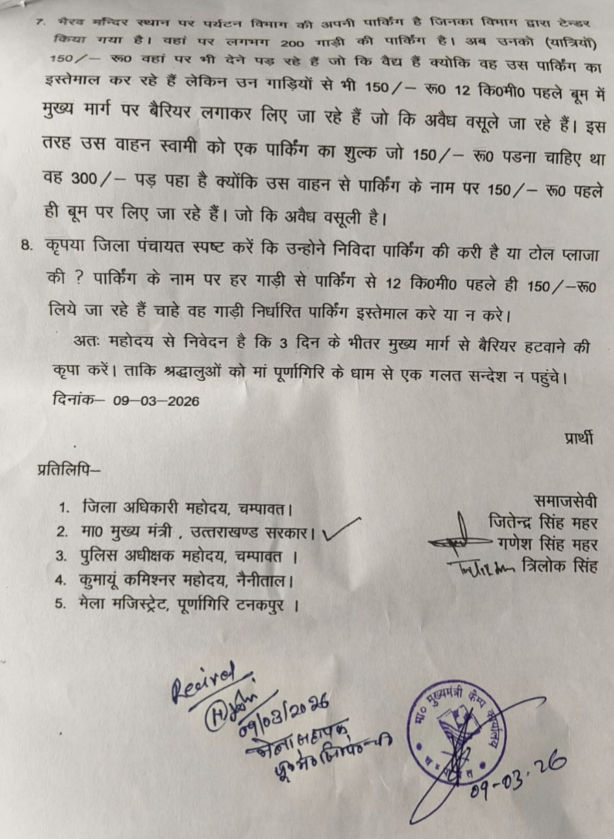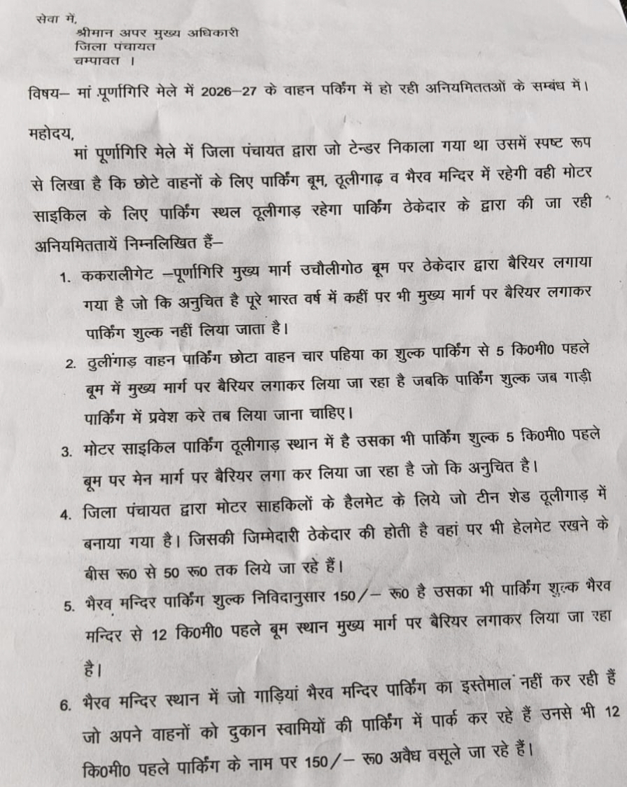रिपोर्ट :लक्ष्मण बिष्ट : चंपावत:पूर्णागिरि मेले में वाहन पार्किंग संचालकों में लगे अनियमितता के आरोप अपर मुख्य अधिकारी को ज्ञापन।