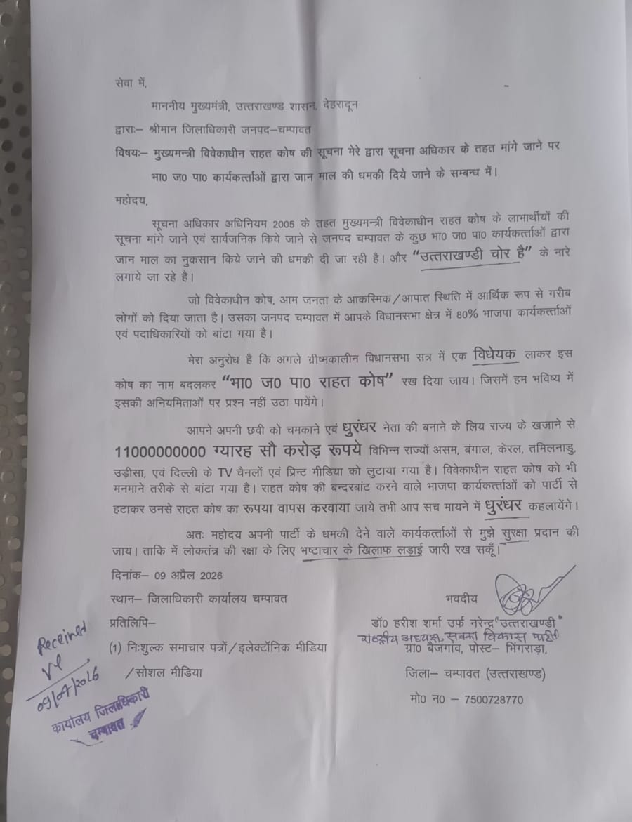 रिपोर्ट:लक्ष्मण बिष्ट : चम्पावत : मुख्यमंत्री विवेकाधीन कोष मे आरटीआई मांगने पर नरेंद्र उत्तराखंडी ने जान से मारने की धमकी मिलने के