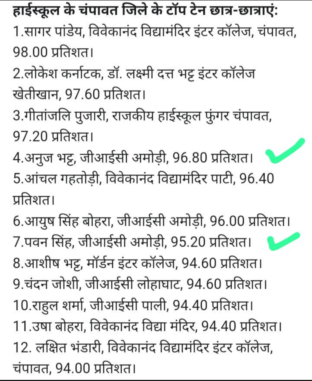 उत्तराखंड बोर्ड की हाईस्कूल परीक्षा में चम्पावत जिले के विद्यार्थियों ने शानदार सफलता हासिल की है। जिले ने हाईस्कूल बोर्ड में उत्तराखंड में सबसे बेहतरीन परीक्षा परिणाम दिया है। मुख्य शिक्षाधिकारी मेहरबान सिंह बिष्ट ने बताया कि हाईस्कूल में परीक्षाफल 96.97 प्रतिशत रहा, जो 2024 की अपेक्षा 3.69 प्रतिशत ज्यादा है। पिछले साल सफलता का ये प्रतिशत 93.28 प्रतिशत था। हाईस्कूल में 2876 परीक्षार्थियों में से 2789 परीक्षार्थी पास हुए। बताया चंपावत के विवेकानंद विद्या मंदिर किस सागर पांडे ने 98% अंक प्राप्त कर चंपावत जिले को टॉप कर अपना परचम लहराया है। सागर ने 500 में से 490 अंक प्राप्त कर चंपावत जिले को टाप बनने के साथ-साथ प्रदेश में सातवां स्थान पाया है। इस बार चंपावत जिले के विद्यार्थियों ने शानदार प्रदर्शन किया है। मुख्य शिक्षा अधिकारी ने सभी विद्यार्थियों को शुभकामनाएं दी है।