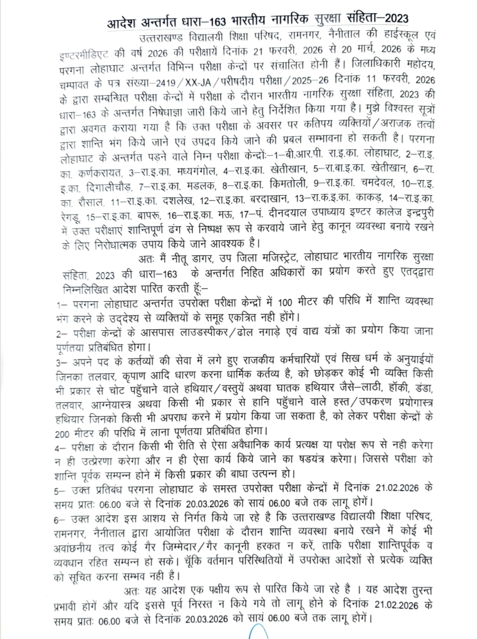 17 फरवरी से 10 अप्रैल2026 तक केंद्रीय माध्यमिक शिक्षा बोर्ड की परीक्षाएं आयोजित की जा रही है । डीएम चंपावत के निर्देश पर जिले के सभी परीक्षा केदो के बाहर बीएनएस की धारा 163 लागू रहेगी। एसडीएम लोहाघाट नीतू डांगर ने आज शुक्रवार को जानकारी देते हुए बताया केंद्रीय माध्यमिक शिक्षा बोर्ड की परीक्षा संपन्न करने के लिए लोहाघाट में राजीव गांधी नवोदय विद्यालय ,केंद्रीय विद्यालय तथा आकलैंड पब्लिक स्कूल में परीक्षा के केंद्र बनाया गया है ।एसडीएम लोहाघाट ने बताया परीक्षाओं को शांतिपूर्ण एवं निष्पक्ष रूप से संपन्न कराने हेतु परीक्षा केंद्रों के 100 मीटर के दायरे में बीएनएस की धारा 163 लागू की जा रही है । एसडीएम ने बताया परीक्षा केंद्रों के 100 मीटर की परिधि में शांति व्यवस्था भंग करने के उद्देश्य से व्यक्तियों के समूह एकत्रित नहीं होंगे। परीक्षा केंद्रों के आसपास लाउडस्पीकर, ढोल नगाड़े, एवं वाद्य यंत्रों का प्रयोग पूर्णतया प्रतिबंधित रहेगा। अपने पद व कर्तव्यों की सेवा में लगे हुए राजकीय कर्मचारी एवं सिख धर्म के अनुयायियों जिनका तलवार, कृपाण आदि धारण करना धार्मिक कर्तव्य है को छोड़कर कोई भी व्यक्ति किसी भी प्रकार से चोट पहुंचाने वाले हथियार जैसे लाठी , हॉकी ,डंडा तलवार, बंदूक अथवा किसी भी प्रकार से हानि पहुंचाने वाले हथियार जिनका किसी भी अपराध करने में प्रयोग किया जा सकता है को लेकर परीक्षा केंद्रों के 200 मीटर की परिधि में लाना पूर्णतया प्रतिबंधित होगा। परीक्षा के दौरान परीक्षा केंद्र के बाहर ऐसा कोई भी कार्य नहीं किया जाएगा जिससे परीक्षा को शांतिपूर्ण संपन्न होने में किसी प्रकार की बाधा उत्पन्न हो ।एसडीएम लोहाघाट ने बताया यह प्रतिबंध परगना लोहाघाट के समस्त परीक्षा केंद्रों में दिनांक 17 फरवरी से प्रातः 6:00 बजे से दिनांक 10 अप्रैल 2026 को सायं 6:00 बजे तक लागू रहेगा। कहा आदेश का उल्लंघन करने पर भारतीय न्याय संगीता की धारा 223 के तहत कार्रवाई की जाएगी।