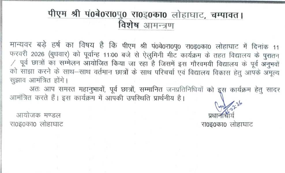 पंडित बेनीराम पुनेठा रा0 इंटर कॉलेज लोहाघाट में विद्यालय प्रबंधन समिति अध्यक्ष मनोहर सिंह करायत की अध्यक्षता व प्रधानाचार्य श्याम दत्त चौबे के संचालन में 11 फरवरी 2026 को आयोजित होने वाले पुरातन व पूर्व छात्रों के सम्मेलन हेतु आज शनिवार को एक तैयारी बैठक का आयोजन किया गया ।जिसमें प्रधानाचार्य चौबे ने एल्यूमिनी मीट सम्मेलन की रूपरेखा प्रस्तुत की तथा नोडल अधिकारी मोनिका सिंह ने मीट के उद्देश्य की जानकारी दी। बैठक में मुख्य अतिथि व विद्यालय के पुरातन छात्र एडवोकेट नवीन मुरारी ने अपने कई महत्वपूर्ण सुझाव देते हुए इस ऐतिहासिक संस्था के कार्यक्रम को भव्य बनाने हेतु पूर्व छात्रों से अधिक से अधिक संख्या में 11 फरवरी को जीआईसी लोहाघाट में पहुंचने की अपील की।