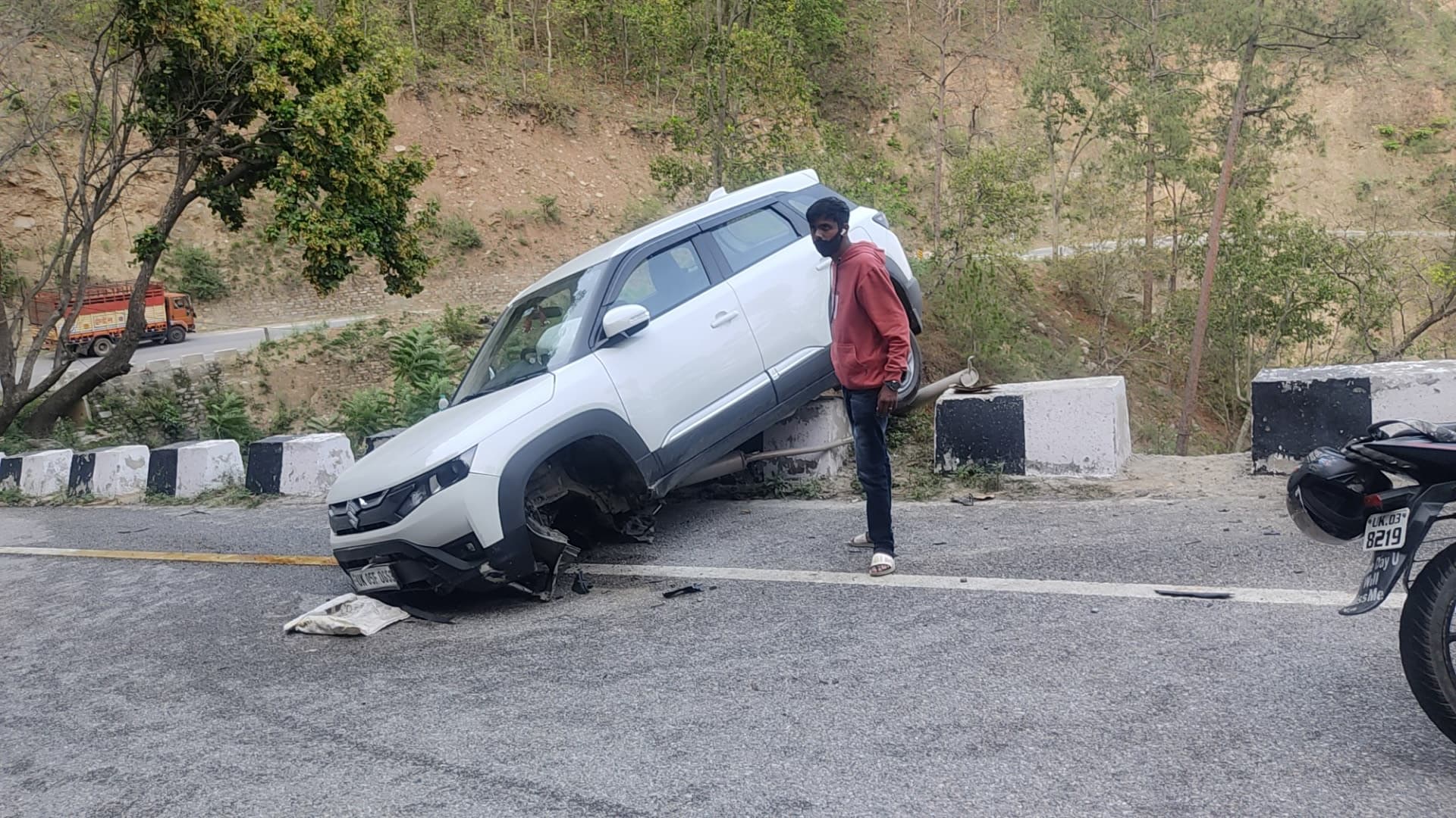 रिपोर्ट: लक्ष्मण बिष्ट 👹👹 : लोहाघाट:पैराफिट से टकराई कार टायर टूट कर हुए अलग बाल बाल बचा बड़ा हादसा खाई में जाने से बची कार।