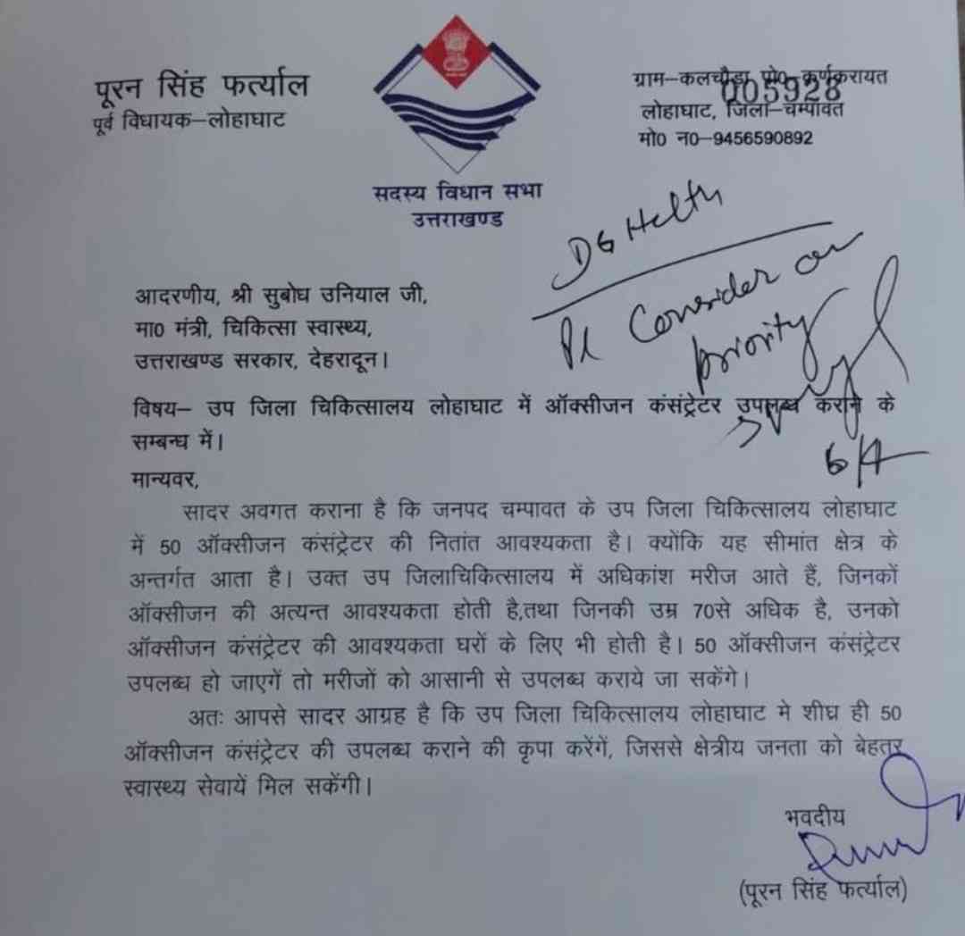 सोमवार को लोहाघाट के पूर्व भाजपा विधायक पूरन सिंह फर्त्याल ने देहरादून में प्रदेश के स्वास्थ्य मंत्री सुबोध उनियाल से उनके देहरादून स्थित आवास पर शिष्टाचार भेंट कर प्रदेश के स्वास्थ्य मंत्री का दायित्व संभालने पर बधाई एवं शुभकामनाएं दीं। स्वास्थ्य मंत्री से मुलाकात के दौरान पूर्व विधायक फर्त्याल ने जनहित में उप जिला चिकित्सालय लोहाघाट में 50 ऑक्सीजन कंसंट्रेटर उपलब्ध कराए जाने की मांग प्रमुखता से उठाई। पूर्व विधायक फर्त्याल ने कहा स्वास्थ्य मंत्री ने मामले की आवश्यकता को समझते हुए स्वास्थ्य महानिदेशक को तत्काल आवश्यक कार्यवाही के निर्देश दिये।