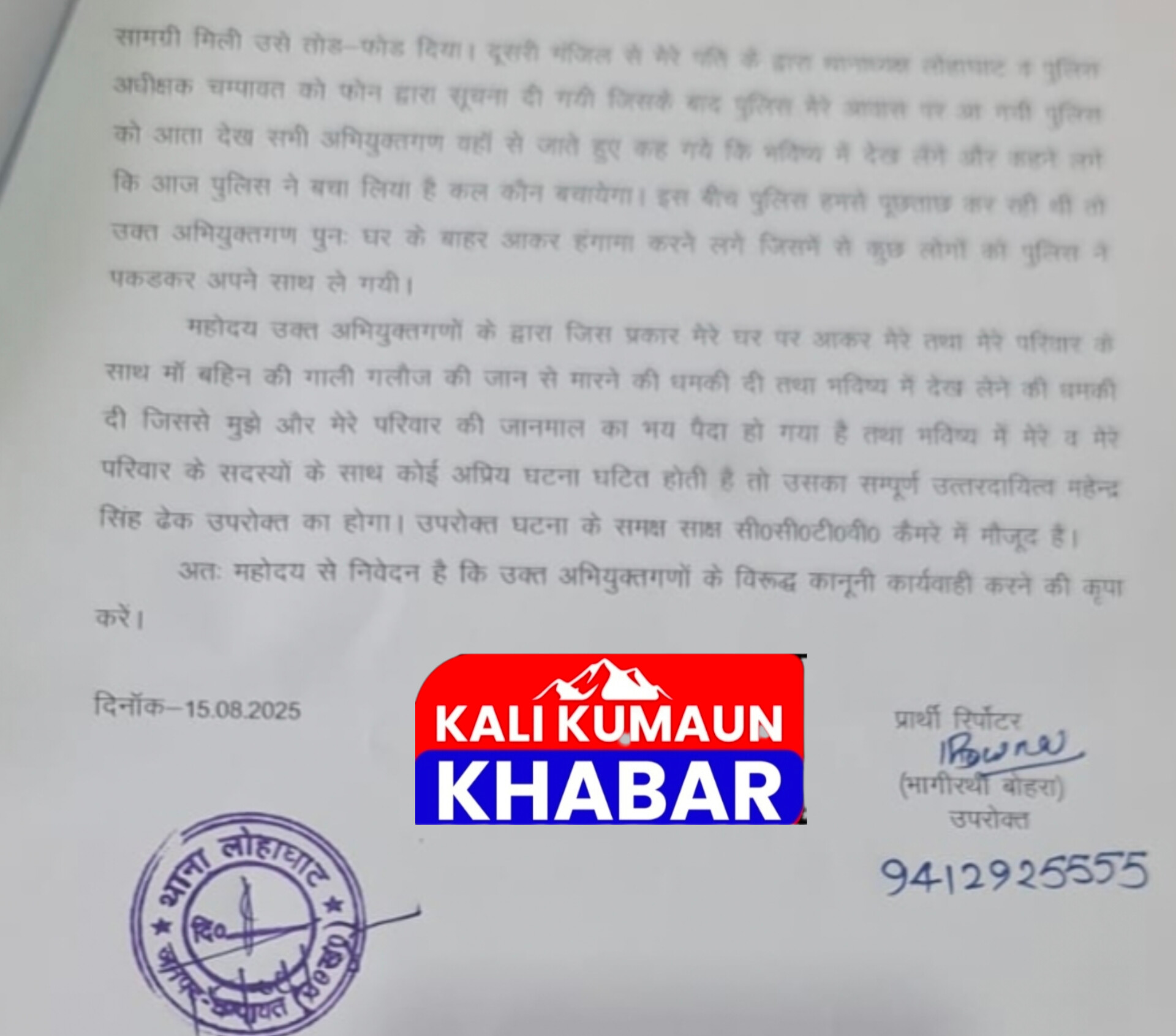बोहरा की पत्नी ने पुलिस में ब्लॉक प्रमुख सहित 10 के खिलाफ दी नामजद तहरीर। जान माल का बताया खतरा। वीडियो सोशल मीडिया में वायरल। प्राथमिक शिक्षक संघ चंपावत जिला अध्यक्ष  गोविंद सिंह बोहरा के घर पर 14 अगस्त गुरुवार की रात कुछ लोगों के द्वारा हमला कर तोड़फोड़ व गाली गलौज की गई है। घटना की तहरीर आज 15 अगस्त शुक्रवार को गोविंद सिंह बोहरा की पत्नी भागीरथी बोहरा के द्वारा लोहाघाट थाने में लोहाघाट के नवनिर्वाचित ब्लॉक प्रमुख महेंद्र सिंह ढेक सहित उनके साथियों पर आरोप लगाते हुए उनके खिलाफ नाम जद तहरीर दी  है। तहरीर में भागीरथी बोहरा के द्वारा घर में घुसकर तोड़फोड़ व जान से मारने का प्रयास करने के गंभीर आरोप लगाए हैं। तहरीर में कहा गया है 14 अगस्त 2025 की रात लगभग 11:00 बजे के आसपास मेरे पति के मोबाइल में काल आई। उसके बाद रात 11:15 बजे के लगभग नवनिर्वाचित ब्लॉक प्रमुख महेंद्र सिंह ढेक अपने साथियों देवेंद्र बोरा ,गिरीश ढेक, दिनेश महरा ,सतीश महरा ,गिरीश महरा ,निर्मल फर्त्याल ,अमित फर्त्याल ,शिवराज सिंह बोरा व गौतम सिंह मेहता के साथ मेरे निवास हथरंगिया(लोहाघाट)के मुख्य गेट को खोलकर मुझे व मेरे परिवार को जान से मारने की नीयत से गिरोह बनाकर घर मे घुसे और मेरे घर का मुख्य दरवाजा तोड़ दिया तथा हाथ में हथियार लहराते हुए हमारे शयन कक्ष में गलत नीयत से घुस गए और कहने लगे आज सभी को जान से मार देंगे और मां बहन की अभद्र भाषा का प्रयोग करने लगे। जिसे देखकर मेरे पति व बच्चे भाग कर दूसरी मंजिल में चले गए और दरवाजे को मजबूती के साथ बंद कर दिया कहा इन लोगों के द्वारा घर में तोड़फोड़ की नीयत से घर का सारा सामान फेंक दिया और जो भी सामान मिला उसे तोड़फोड़ दिया। दूसरी मंजिल में मेरे पति के द्वारा थाना अध्यक्ष लोहाघाट व पुलिस अधीक्षक चंपावत को फोन द्वारा सूचना दी गई जिसके बाद पुलिस मेरे आवास पर पहुंची पुलिस को आता देख सभी लोग वहां से भाग गए और भविष्य में देख लेने की धमकी दी तहरीर में कहा गया है इस बीच पुलिस हमसे पूछताछ कर रही थी तो यह लोग वापस घर के बाहर आकर हंगामा करने लगे जिसमें से कुछ लोगों को पुलिस पकड़ कर अपने साथ ले गई।