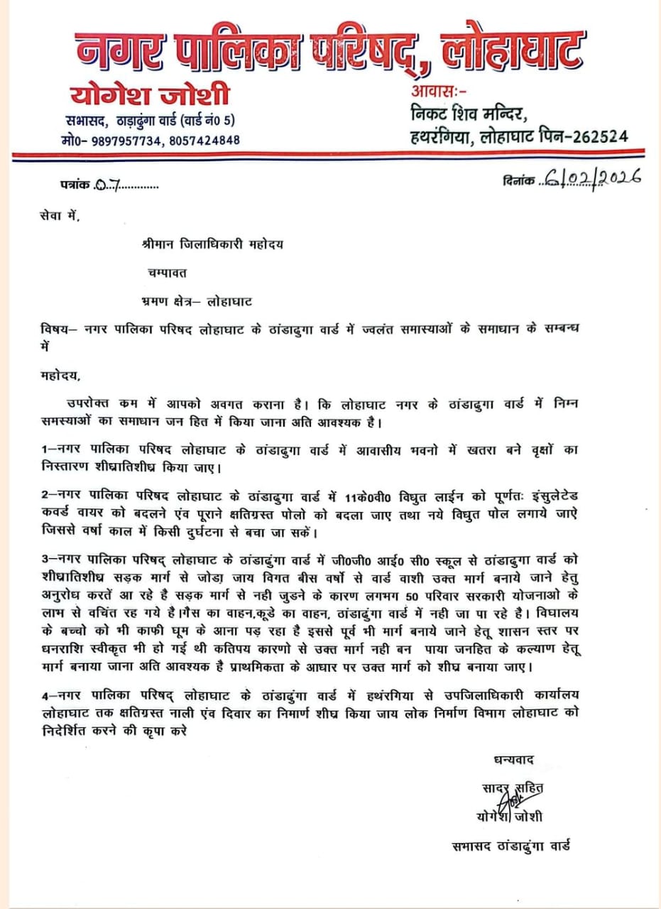 लोहाघाट नगर के ठाड़ा ढुंगा वार्ड के सभासद योगेश जोशी के द्वारा जन-जन की सरकार जन-जन के द्वारा में अपने वार्ड की विभिन्न समस्याओं को रखते हुए समाधान की मांग की। सभासद योगेश जोशी ने डीएम के सम्मुख आवासीय भवनों के लिए खतरा बने पेड़ों का निस्तारण, घरों के आसपास से गुजर रही 11 केवी विद्युत लाइन मे इंसुलेटेड कवर्ड वायर लगाने एवं पुराने क्षतिग्रस्त विद्युत पोलो को बदलने, जीजीआईसी विद्यालय से ठाड़ा ढुंगा वार्ड को सड़क मार्ग से जोड़ने की मांग की उन्होंने कहा सड़क मार्ग न होने के कारण 50 परिवार सरकारी योजनाओं के लाभ से वंचित रह गए। उन्होंने बताया सड़क न होने के कारण गेस व कूड़े का वाहन नहीं आ पा रहा है तथा विद्यालय के बच्चों को भी काफी घूम कर जाना पड़ता है।उन्होंने कहा इससे पूर्व भी मार्ग बनाए जाने हेतु शासन स्तर पर धनराशि स्वीकृत हो गई थी पर कतिपय कारणों से उक्त मार्ग नहीं बन पाया। उन्होंने जिलाधिकारी से जनहित को देखते हुए इस मार्ग को बनाने की मांग की। इसके अलावा हथरिया से उप जिला अधिकारी कार्यालय तक क्षतिग्रस्त नाली एवं दीवाल निर्माण के लिए लोक निर्माण विभाग लोहाघाट को निर्देशित करने की मांग की। मामले का जिलाधिकारी ने संज्ञान लेते हुए संबंधित विभागों को जल्द समस्या के समाधान करने के निर्देश दिए है।