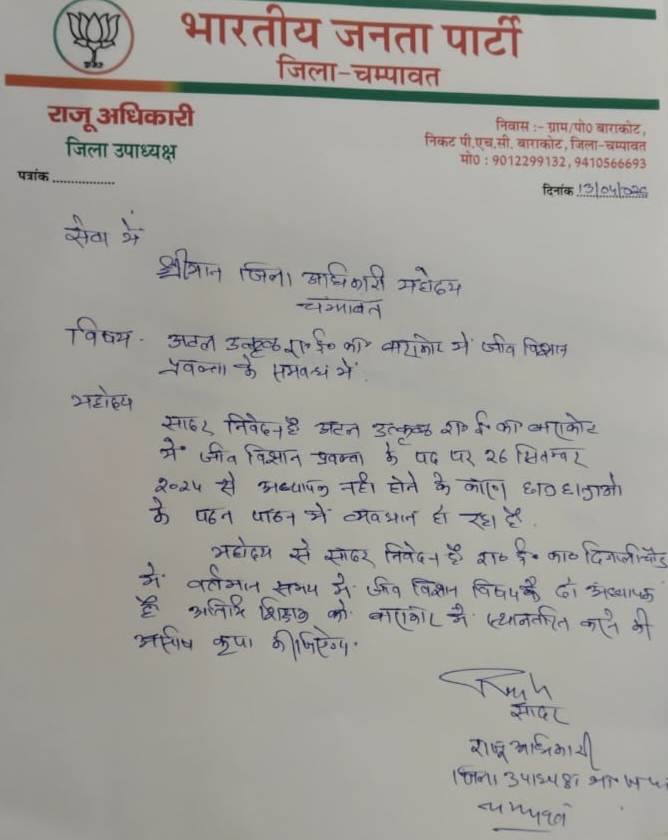 रिपोर्ट:जगदीश जोशी : भाजपा जिला उपाध्यक्ष अधिकारी की मांग पर डीएम ने जीआईसी बाराकोट में जीव विज्ञान प्रवक्ता की तैनाती