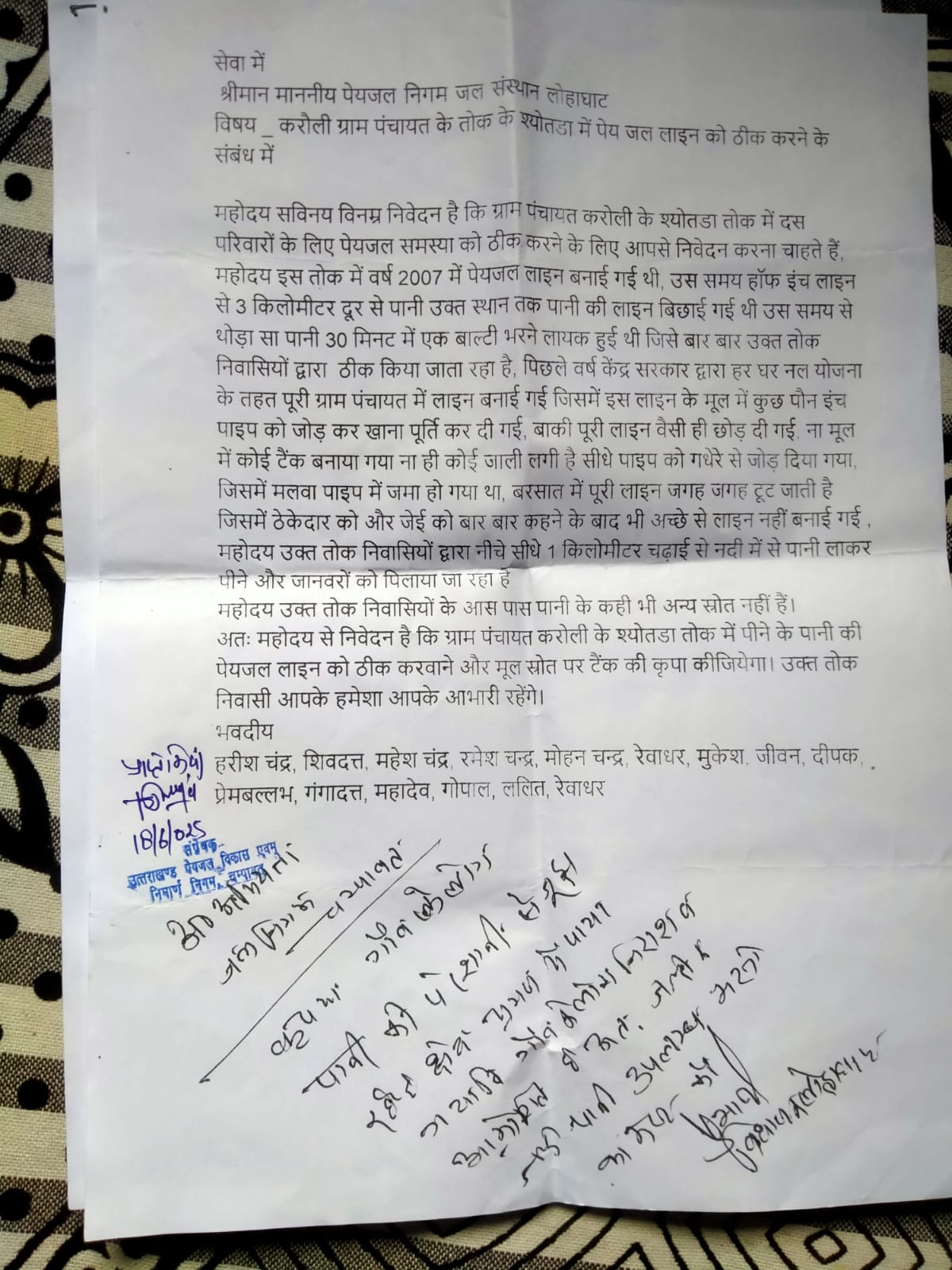 कहा मूल स्रोत में भरपूर पानी उपलब्ध हैं लेकिन विभागीय लापरवाही के चलते लोग प्यासे है। ग्रामीणों ने संबंधित विभाग पर लापरवाही के आरोप लगाए हैं। ग्रामीणों ने जिलाधिकारी चंपावत से उनकी पेयजल समस्या के समाधान की मांग की है। ग्रामीणों ने कहा अगर समस्या का समाधान नहीं होगा तो ग्रामीण आंदोलन को बाध्य होंगे। मांग करने में हरीश चंद्र ,महेश चंद्र ,रेवाधर, शिव दत्त, मुकेश, रमेश, मोहन, जीवन , दीपक, पंकज, जानकी , पार्वती, आरती, ईश्वरी, ममता, गोपाल, ललित आदि मौजूद रहे।