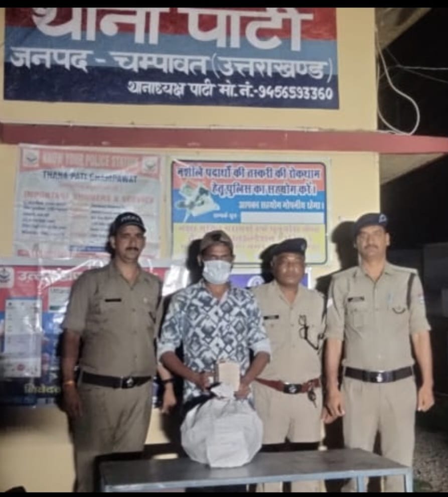 एसपी चंपावत अजय गणपति के निर्देश पर चलाए जा रहे नशा मुक्ति देवभूमि अभियान के तहत थाना पाटी पुलिस ने कार्यवाही करते हुए सोमवार को पाटी क्षेत्र के किमाडीधार के पास अभि0 मोहसीन पुत्र मौ0 अनीस नवासी साउथ खालापार थाना सदर कोतवाली मुजफ्रर नगर हाल किरायेदार जाकीर हुसैन उर्फ मुन्ना विसग रोड लोहाघाट के कब्जे से 50 पव्बे टेट्रा पैक देशीमशालेदार माल्टा शराब बरामद कर गिरफ्तार किया । आरोपी के थाना पाटी में धारा 60(1) एक्ट का अभियोग पंजीकृत किया गया है। पुलिस टीम में अपर उ0नि0 अन्तराम राणा थाना पाटी, हे0का0 रमेश गोस्वामी,का0 कमल गोस्वामी,का0 चालक दीपक सिंह शामिल रहे।